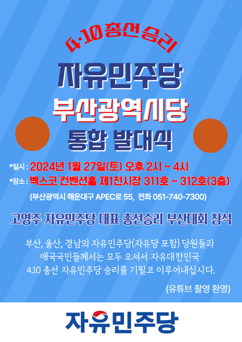 『자유민주당 4·10 총선승리 부산광역시당 통합 발대식』이 1월 27일 아래와 같이 개최됩니다.