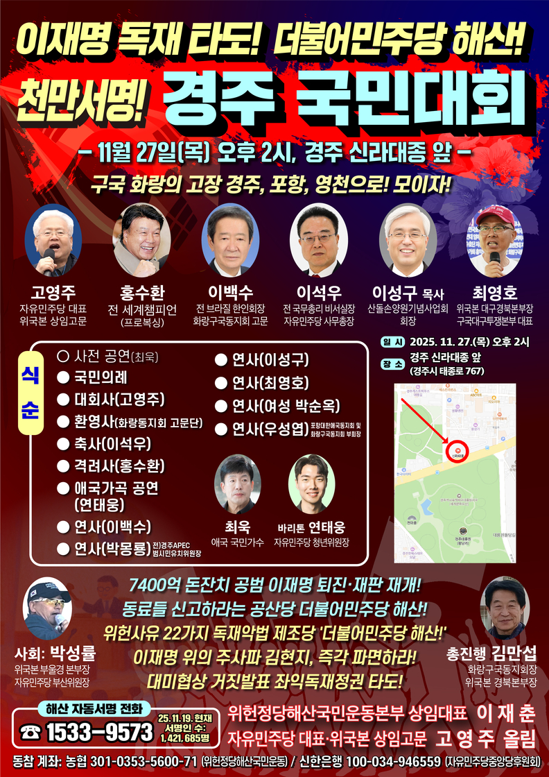 이번 국민대회는 경남의 「나라사랑연합회」, 경북 경주 「화랑구국동지회」, 포항 「대한애국동지회」 등 현지의 애국시민사회단체들이 대거 동참해 전국적으로 번지고 있는 "이재명 퇴진·재판 재개" 국민 여망이 폭발적으로 모이게 됐다.
