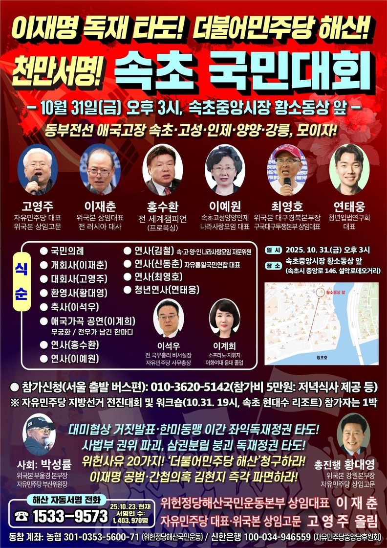 자유민주당(대표 고영주)과 위헌정당해산국민운동본부(위국본. 상임대표 이재춘 전 러시아 대사)는 오는 10월 31일(금) 오후 3시, 속초 중앙시자 황소동상 앞에서 ‘이재명 독재 타도! 더불어민주당 해산! 천만서명 속초 국민대회’를 개최한다.