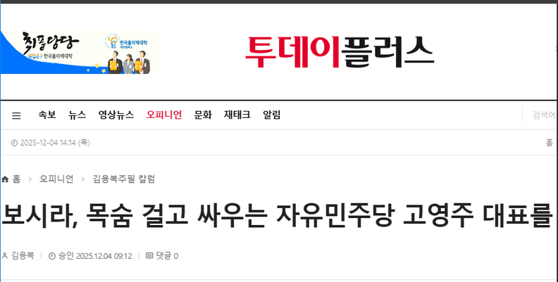 국회에 이렇게 목숨 걸고 싸우는 정의의 투사가 한 사람만 있었어도 어찌 이재명 정부가 들어설 수 있었겠는가? 좌파들은 지시가 떨어지면 그게 옳은 일이든 옳지 않은 일이든 똘똘뭉쳐 싸운다. 그런데 국민의힘을 보라. 배신자 25명이 또 나와 장동혁 대표에게 화살을 날리고 있지 않은가?