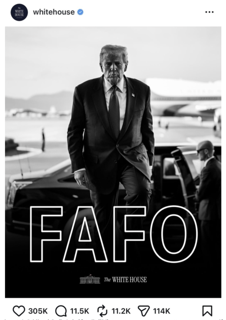 미국은 마두로 체포 바로 다음날 백악관 공식 채널에 'FAFO'("F*** around and find out"의 약어로, 대략 "까불면 대가를 치른다"는 식의 속어) 문구를 내건 게시물을 올렸다. 자국의 적대세력뿐 아니라, 줄타기·모호성·양다리 외교로 '미국의 이익'을 시험하려는 모든 상대에게 보내는 메시지다.