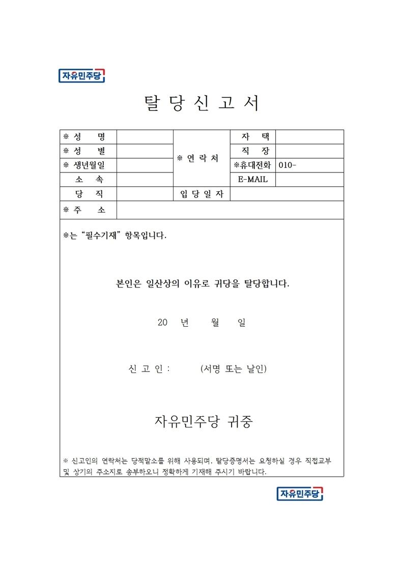 탈당을 원하시는 분께서는 탈당신고서 접수를 해주시기 바랍니다.