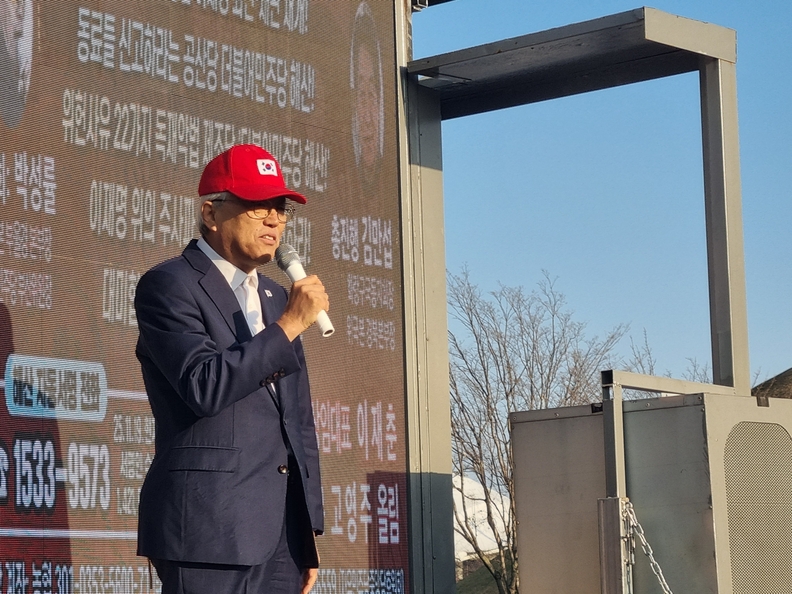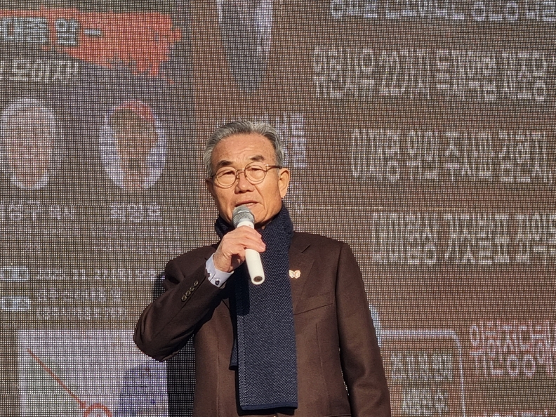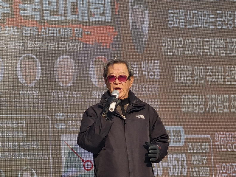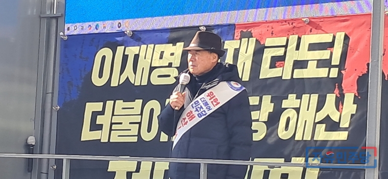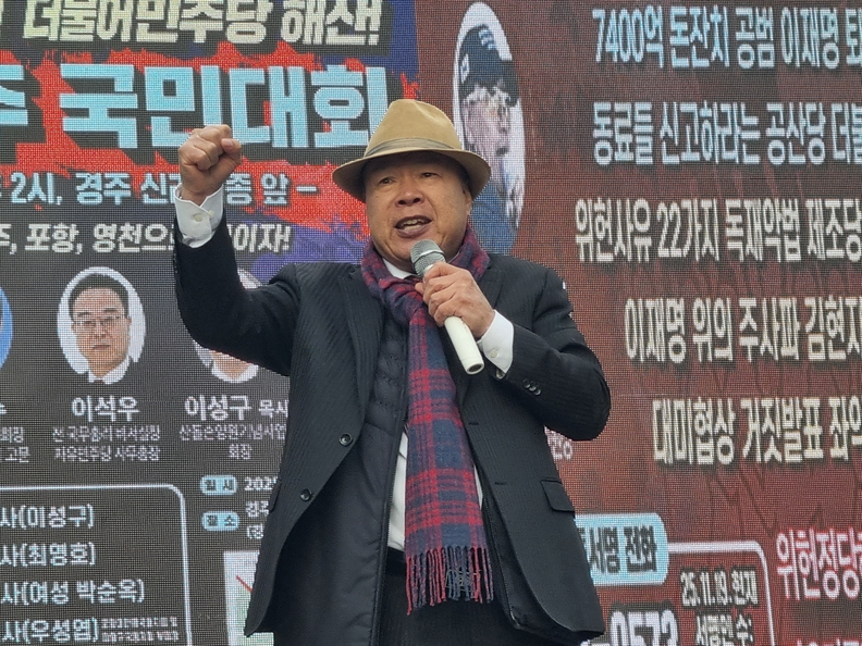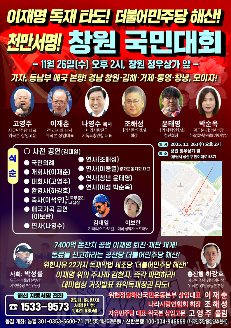 26일 오후 창원 정우상가 앞에서 열린 창원 국민대회는 지역 전역 30여 곳에 사전에 설치된 현수막들과 함께 이미 시작 전부터 열기가 달아올랐다. 현장에는 나라사랑연합회(나사연), 경남권 시민들이 집결했고 고영주 대표, 이재춘 전 러시아 대사, 조숙희 나사연 부회장, 나영수 목사 등이 연단에 올라 잇따라 '이재명 더불어민주당 해산' 발언을 이어갔다.