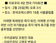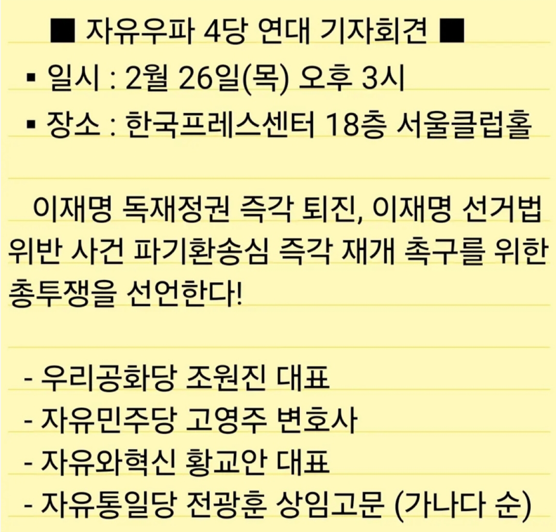 자유우파 4당(우리공화당·자유민주당·자유와혁신·자유통일당)은 오는 2월 26일(목) 오후 2시 30분 서울 프레스센터에서 공동 기자회견을 열고 이재명 정권 퇴진을 위한 총투쟁을 공식 선언할 예정이라고 밝혔다.