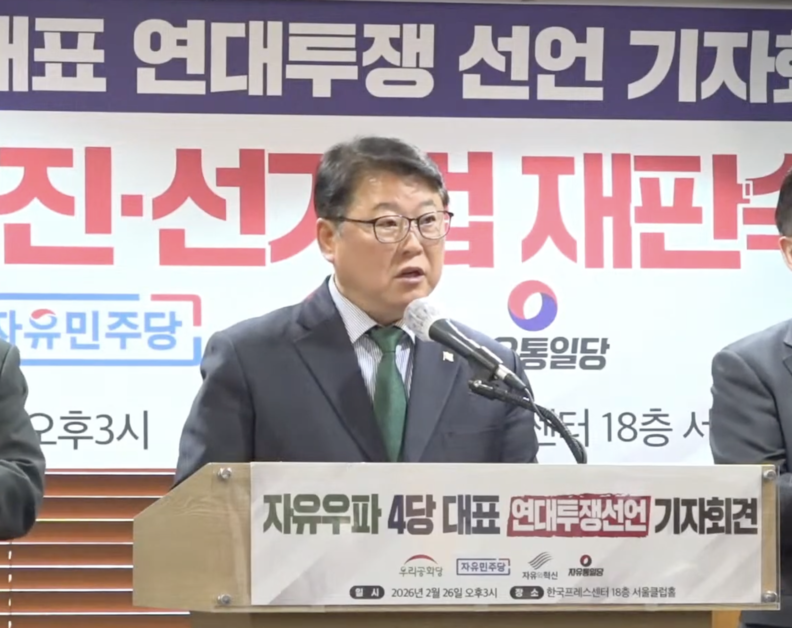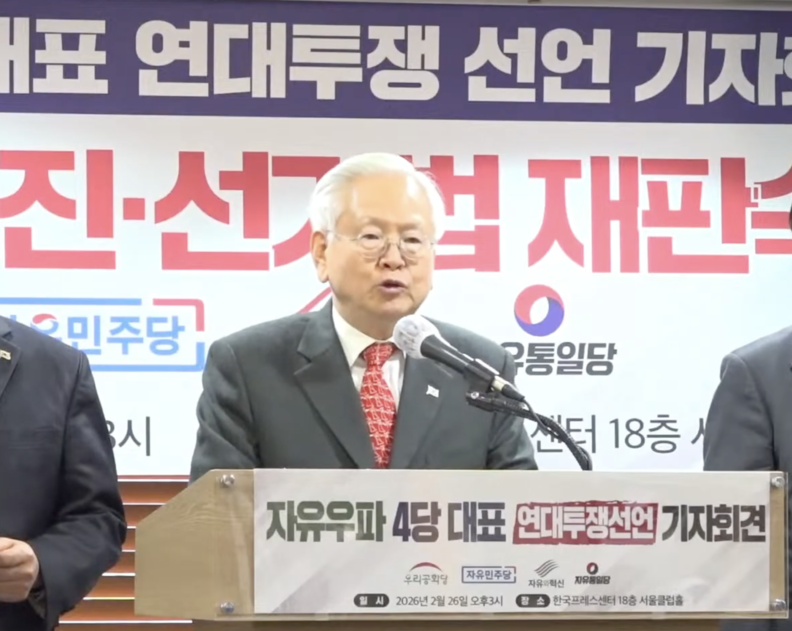 자유우파 4당(우리공화당·자유민주당·자유와혁신·자유통일당)이 26일 서울 중구 한국프레스센터에서 '이재명 정권 퇴진과 공직선거법 재판 속개'를 내건 연대투쟁 선언 기자회견을 열고 공동 행동에 나서겠다고 밝혔다.