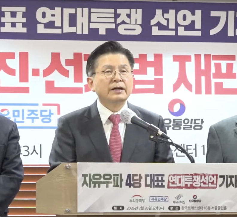 황 대표는 입법·행정·사법 영역 전반에서 권력 집중이 진행되고 있다고 지적하며 "삼권분립은 권력이 국민을 억압하지 못하도록 하는 헌법상의 안전장치"라고 설명했다. 이어 "지금 독재의 열차가 달리고 있다”며 “이를 막아내는 것이 자유우파의 역사적 책무"라고 덧붙였다.