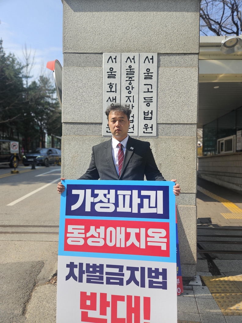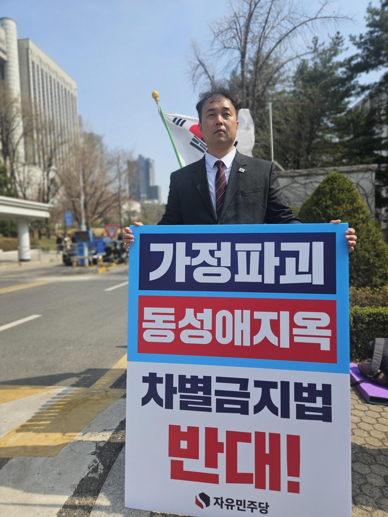 자유민주당 정가람 구의원 예비후보가 3월 24일 서울고등법원 앞에서 차별금지법 제정에 반대하는 1인 시위를 진행했다.